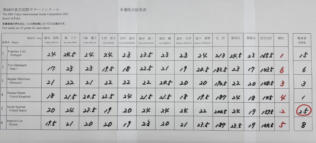 results of the final round of the Tokyo International Guitar Competition are as follows!