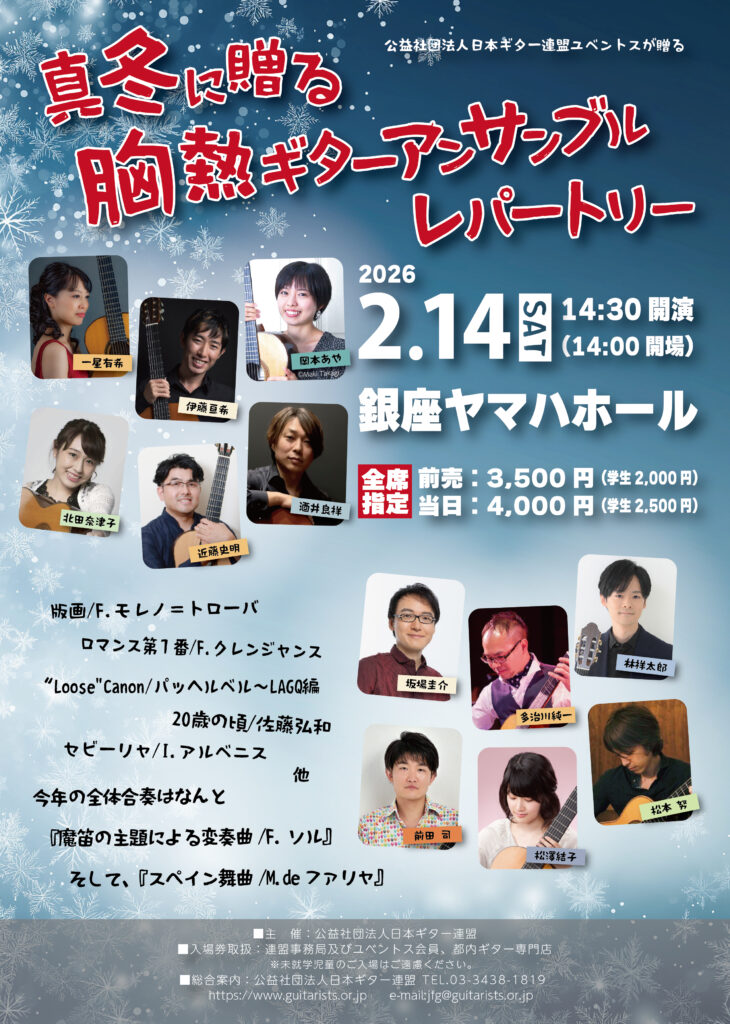 2026年2月14日(土)14:30開演会場:銀座ヤマハホール問合せ:03-3438-1819(連盟事務局)入場料:全席指定/前売り3,500円(学生2,000円)、当日4,000円(学生2,500円)